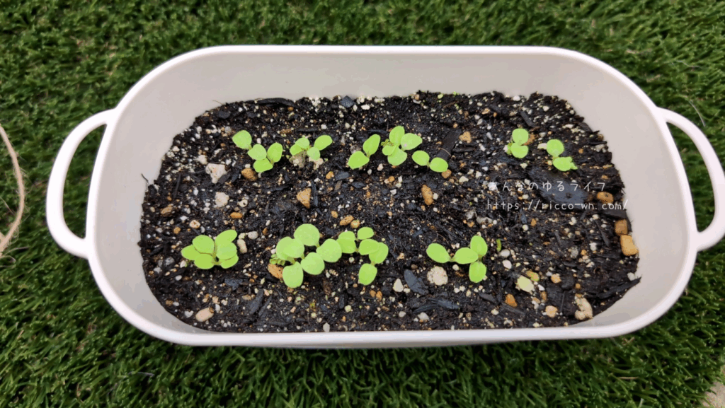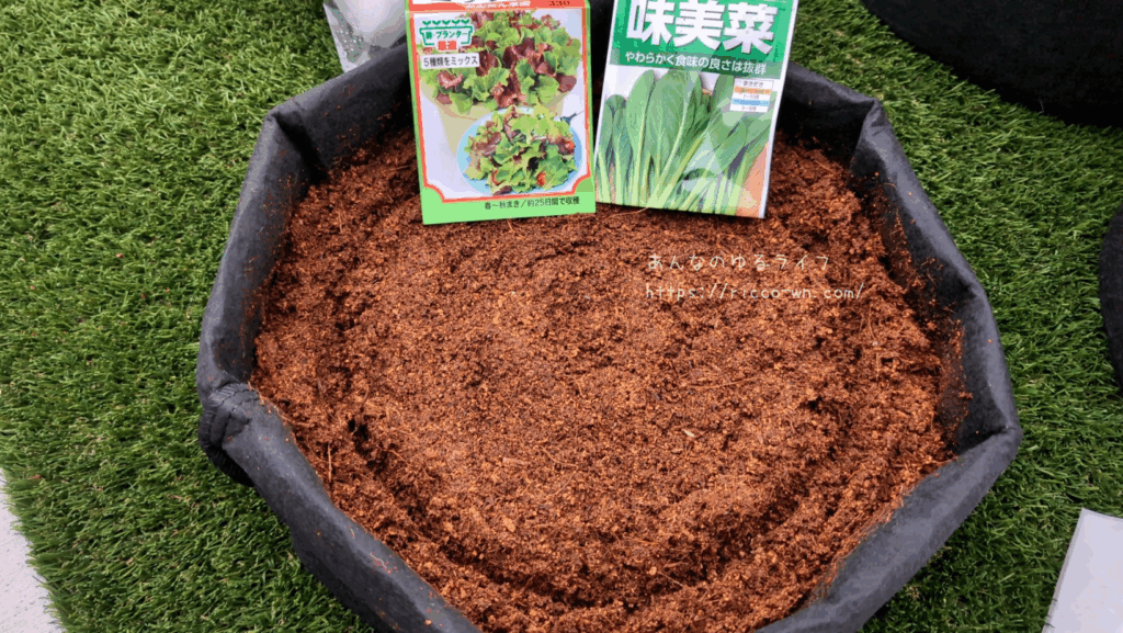 不織布プランターの方は、小松菜の仲間?(品種改良?)の味美菜を一緒にまいてみました。